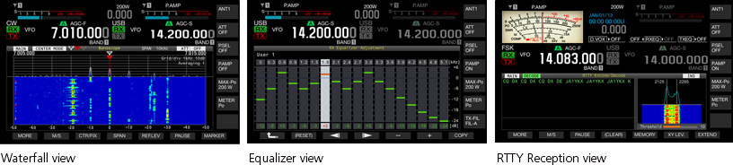The main display shows basic information about the frequency, mode, meter, and other functions, as well as the on/off status of the other accessory functions. You can also view internal parameter settings and memory lists. In addition, it features a band scope function that allows you to monitor band status. Execute fast sweeps with FFT processing using DSP. Switch to different view modes such as waterfall and reception/transmission equalizer views.