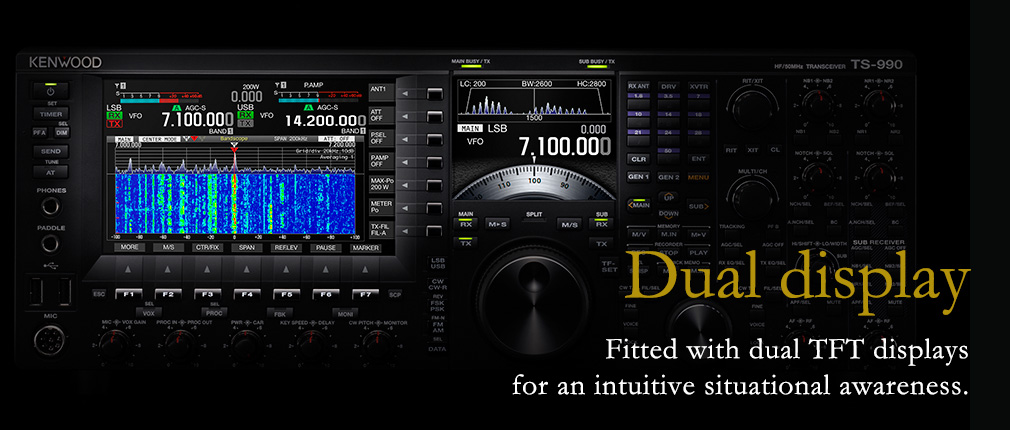 The 3.5″ TFT sub band display is located above the main knob, which not only reduces eye movement in reading the frequency, but also allows you to monitor the target signal itself by displaying the demodulated audio spectrum. In addition, filter effects can be displayed on the easy-to-see sub band display, allowing for intuitive operation. You can switch the sub band display among the four different view modes below according to your intention.